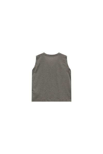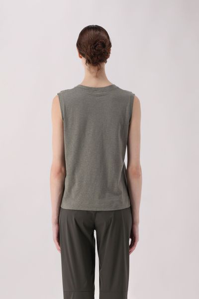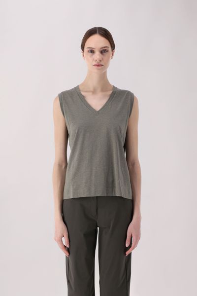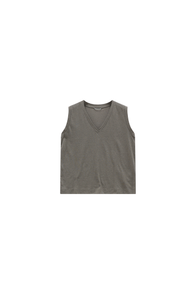 Ärmelloses T-Shirt mit leicht verkürztem Schnitt und V-Ausschnitt. Hergestellt aus Baumwoll-Hanf-Jersey, einem hoch atmungsaktiven, natürlich wirkenden Stoff, zeichnet es sich durch sein minimalistisches und entspanntes Design aus, perfekt für die heißesten Tage des Jahres.