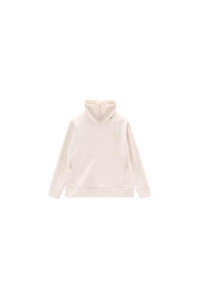 Halbzip-Fleece aus Modal, einem elastischen, extrem weichen und natürlich atmungsaktiven Stoff. Die loose Passform mit überschnittenen Schultern, der hochverstellbare Kragen mit Kordelzug und die praktische vordere Kängurutasche mit unsichtbarem Reißverschluss an den Seiten machen dieses Kleidungsstück zur idealen Wahl für einen Look, der Komfort, Praktikabilität und Raffinesse vereint.