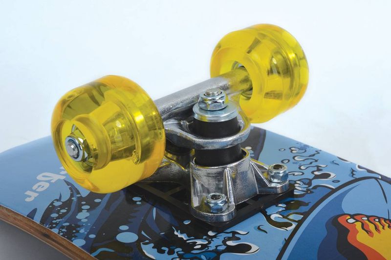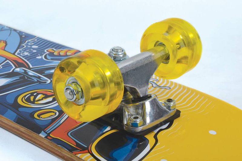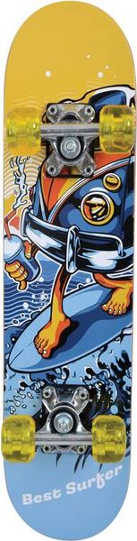 Das Junior-Board aus der neuen Schildkröt Skateboard-Line ist das perfekte Freizeit-Skateboard. Das Board im Design Sticker ist mit einem Deck (60,5 x 15cm) aus 8-fach verleimten Ahorn Holz ausgestattet. Das Skateboard verfügt über ein Doppel-Kick Deck und ein Griptape das für einen sicheren und rutschfesten Stand während der Fahrt sorgt. Das Skateboard ist mit robusten Aluminium-Trucks, PU-Rollen (Härtegrad 82A, Größe: 50x36mm) und 608Z Kugellagern bereits komplett einsatzbereit montiert. Das Junior-Board bringt nur 1,4kg auf die Waage und kann somit einfach überall mit hingenommen werden. Die maximale Belastbarkeit des Skateboards sind 50,0kg. Die über 100 Jahre alte deutsche Marke Schildkröt gilt als Erfinder des Tischtennisballs. Heute bietet Schildkröt neben Tischtennis auch eine sehr umfangreiche Funsports- und Funwheel Kollektion an und gilt als Marktführer in diesem Bereich. Die Produktentwicklung erfolgt ausnahmslos in Deutschland. Die weltweiten Produktionsstätten werden streng überwacht und genügen höchsten Sozialstandards. Warnhinweise: ACHTUNG: vor Benutzung Gebrauchsanleitung lesen und beachten / nur mit geeigneter Schutzausrüstung benutzen / Nicht im Straßenverkehr verwenden / Benutzung nur durch eine Person / die Aufsicht durch einen Erwachsenen wird dringend empfohlen.