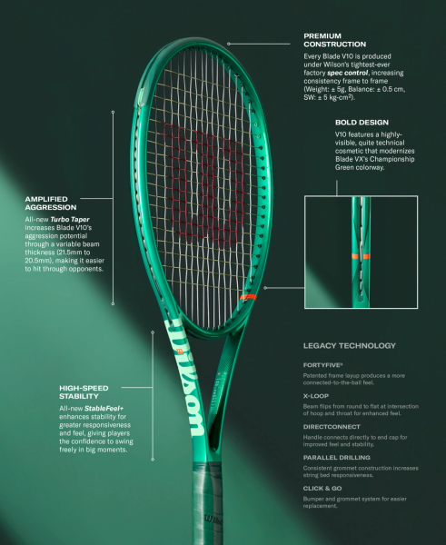 Die Hochleistungs-Tennisschläger Blade von Wilson bieten perfekte Kontrolle, damit du in wichtigen Momenten die Oberhand gewinnst. Für die zehnte Generation dieser legendären Produktreihe haben wir das Design verbessert und auf moderne Spielerinnen und Spieler abgestimmt. Dabei haben wir aus der Erfahrung mit den neun Generationen davor geschöpft. Beim Blade 98 16x19 V10 haben wir die Rahmenhöhe am oberen Ende des Schlägers um 1 mm erhöht, sodass sich der Rahmen dezent verjüngt. Dies verbessert die Stabilität des Schlägerkopfs, sodass du mühelos kraftvoll und noch aggressiver spielen kannst. Wir haben auch die Konstruktion aktualisiert, sodass der Schläger jetzt branchenführende 3 Grad Torsionsstabilität aufweist. Dabei bleibt das charakteristische Spielgefühl, durch das sich der Blade auszeichnet, erhalten. Das offene Saitenmuster ermöglicht kraftvollere Schläge und mehr Spin, und die Farbe Championship Green zieht auf dem Court alle Blicke auf sich.