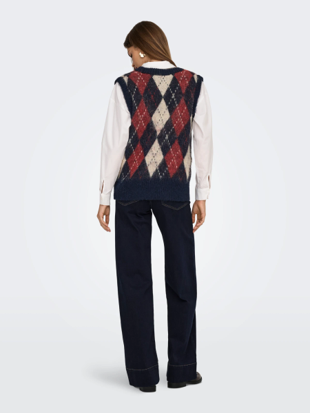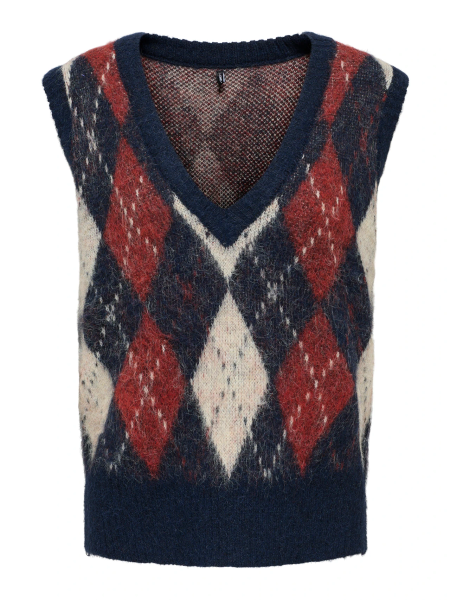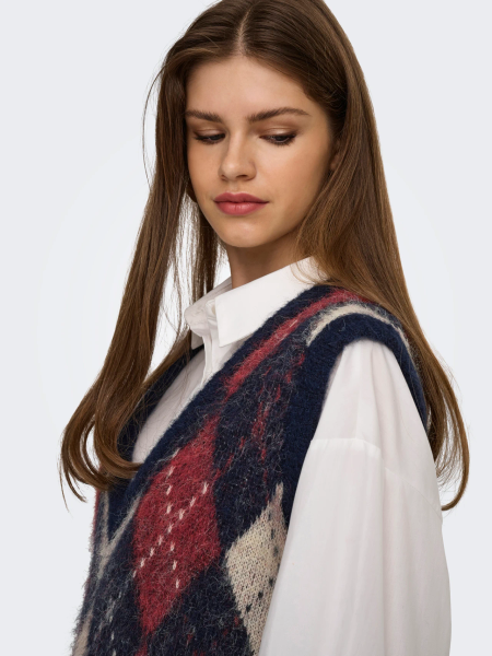 Die ONLY ONLNOEME LIFE SL JQ VEST ist eine stilvolle Damen-Strickweste mit modischem V-Ausschnitt und feinem Jacquard-Muster.